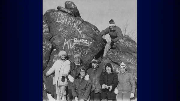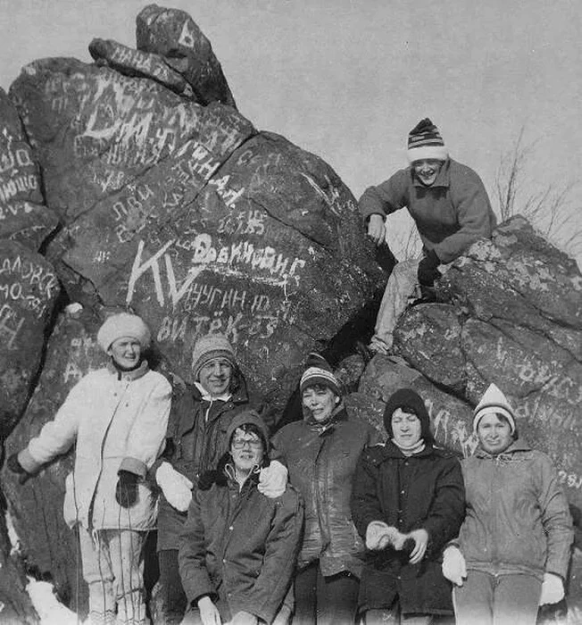 Качканар. АСУ и ТП в сторону Утянки ~1994, на скале - Пузыревский Владимир Семёнович (вечный зам начальника цеха).Юрий Бурухин, в очках, его придерживает Куркин Владимир Михайлович (начальник цеха), справа от него - Козлова Елена (оператор ЭВМ, спортивный профорг цеха), совсем слева - Раиса Чайникова [...]