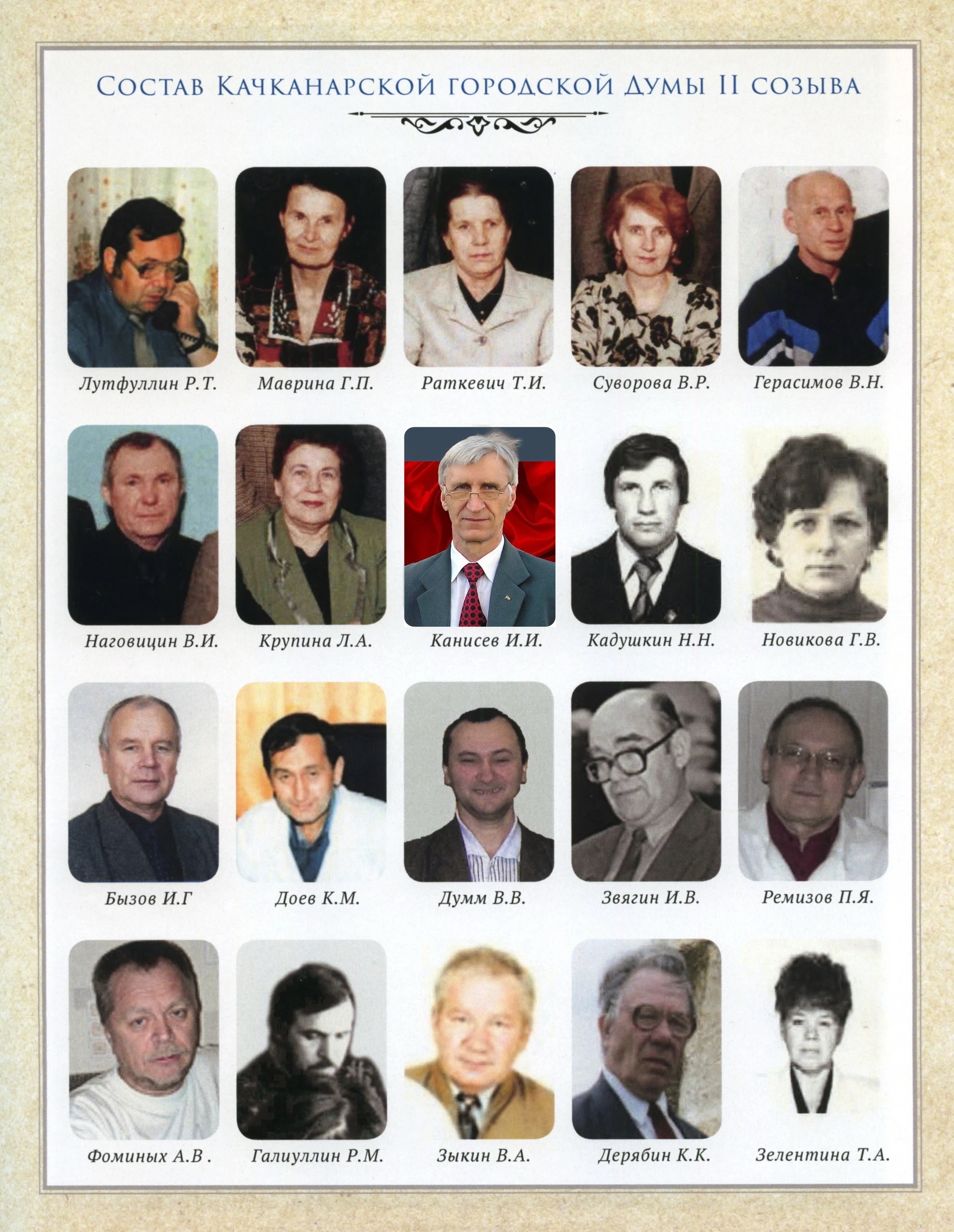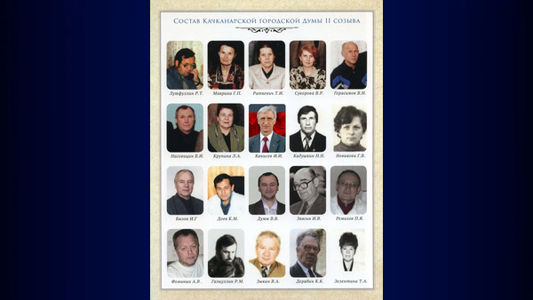 Состав Качканарской городской думы 2-го созыва. (1996 - 2000 г.г.).Лутфуллин Р.Т, Маврина Г.П., Рашкевич Т.И., Суворова В.Р., Герасимов В.Н., Наговицин В.И., Крупина Л.А., Канисев И.И., Кадушкин Н.Н., Новикова Г.В., Бызов И.Г., Доев К.М., Думм В.В., Звягин И.В., Ремизов П.Я., Фоминых А.В., Галлиулин [...]