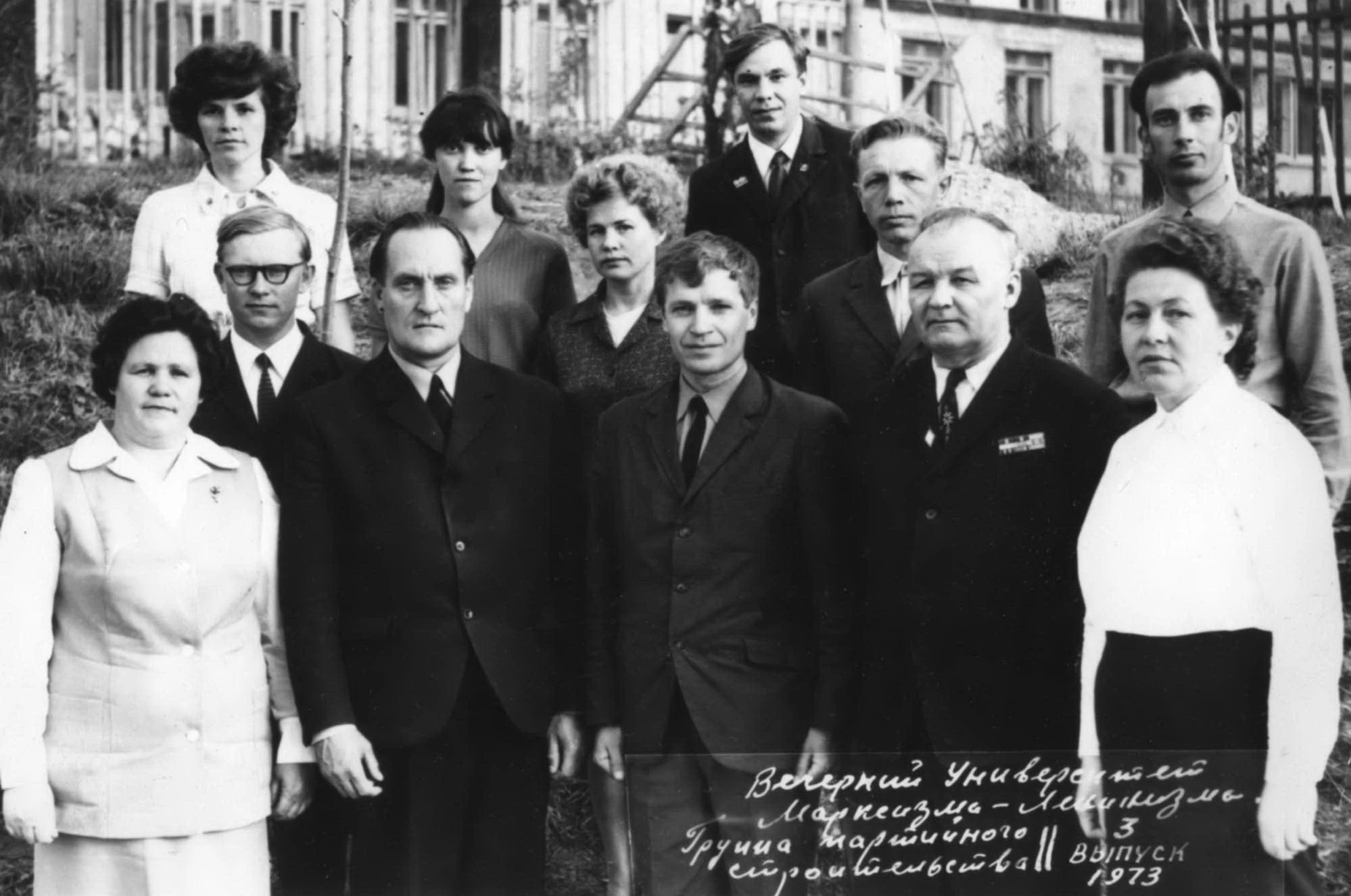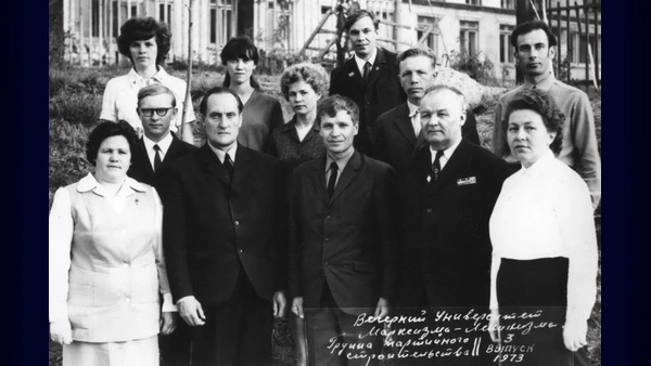 Изображение: Точная дата неизвестна, ориентировочно 1973 годКачканар. 1-й ряд, справа налево: Шитоева В.П., Новиков К.Н., Краснопевцев В.А., Корницкий П.А., ...?...? 3-й ряд, 2-я слева: Тамара Викторовна Вертилецкая, рядом с ней Галина Краснопевцева. Справа - Бахтин Геннадий Федорович.Вечерний университет марксизма-ленинизма. Группа партийного строительства. [...]