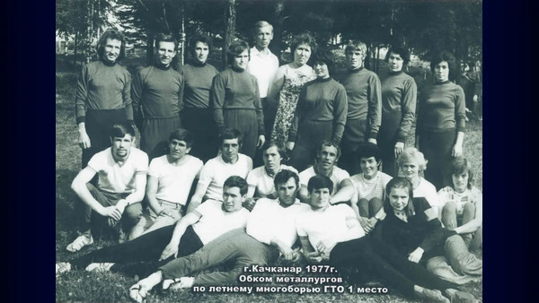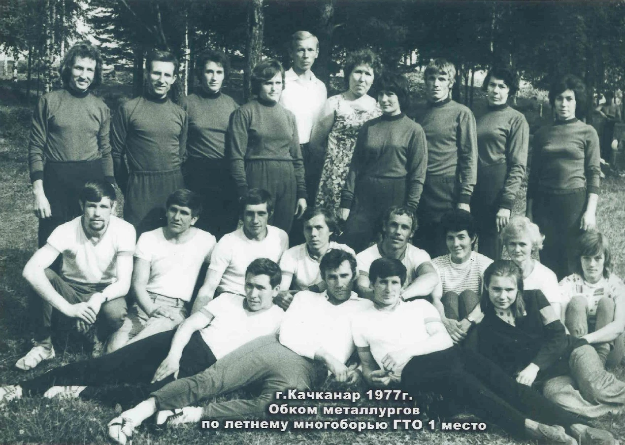 Качканар. 1977 год.Хасанов Юрий, Васильев Алексей, Шашмурина Алла, Зайцева Галина, Дроздов Анатолий, Зверева М., Мазалович Иван, Клещева, Гайденко Нина, Желонкин Николай, Соколов Юрий, Волков Анатолий, Мельников, Шеломенкова Татьяна, Белоусова ТамараИз архива Ивана Канисева