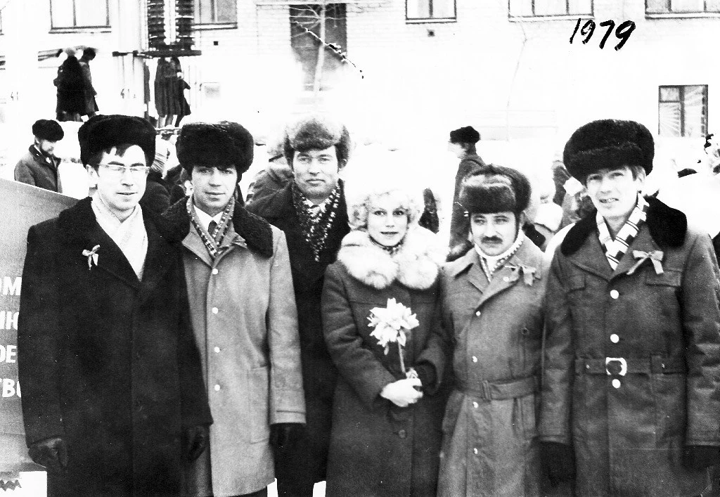 Качканар. КРЗ. 7 ноября 1979 года. На демонстрации. Ахмадеев Р., Загайнов В., Плесовских В.А., Скутин С.З., Игнатович А. Из архива Ивана Канисева