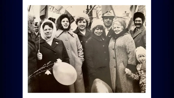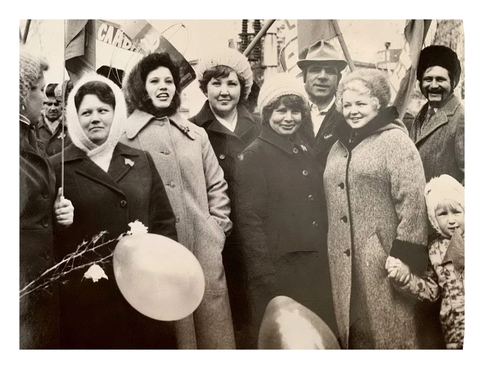 Изображение: Точная дата неизвестна, ориентировочно 1980 годКРЗ. Качканар. На демонстрации. 1980-е годы. Масленникова Л.А., Гвоздева Л.А., Микрюков В.А., Петров Н.А., Микрюкова Р.А., Бутц О.И., Маркелова Л.М., Галина Плесовских. Из архива Ивана Канисева