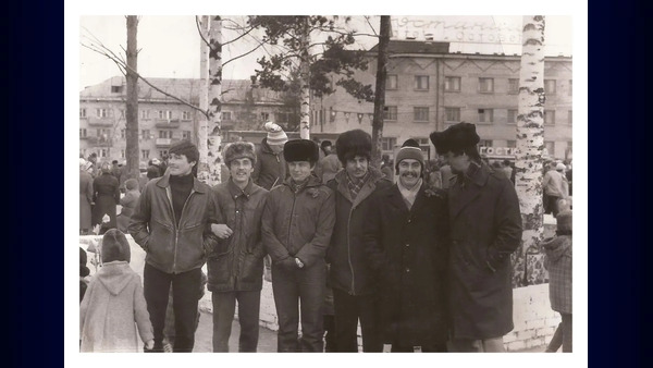 Качканар. 7 ноября. 1980-е годы. Справа налево. Борис Даутов, Сергей Грицков, Александр Ильичев, Валерий Шадрин, (?), (?). Из архива Ивана Канисева