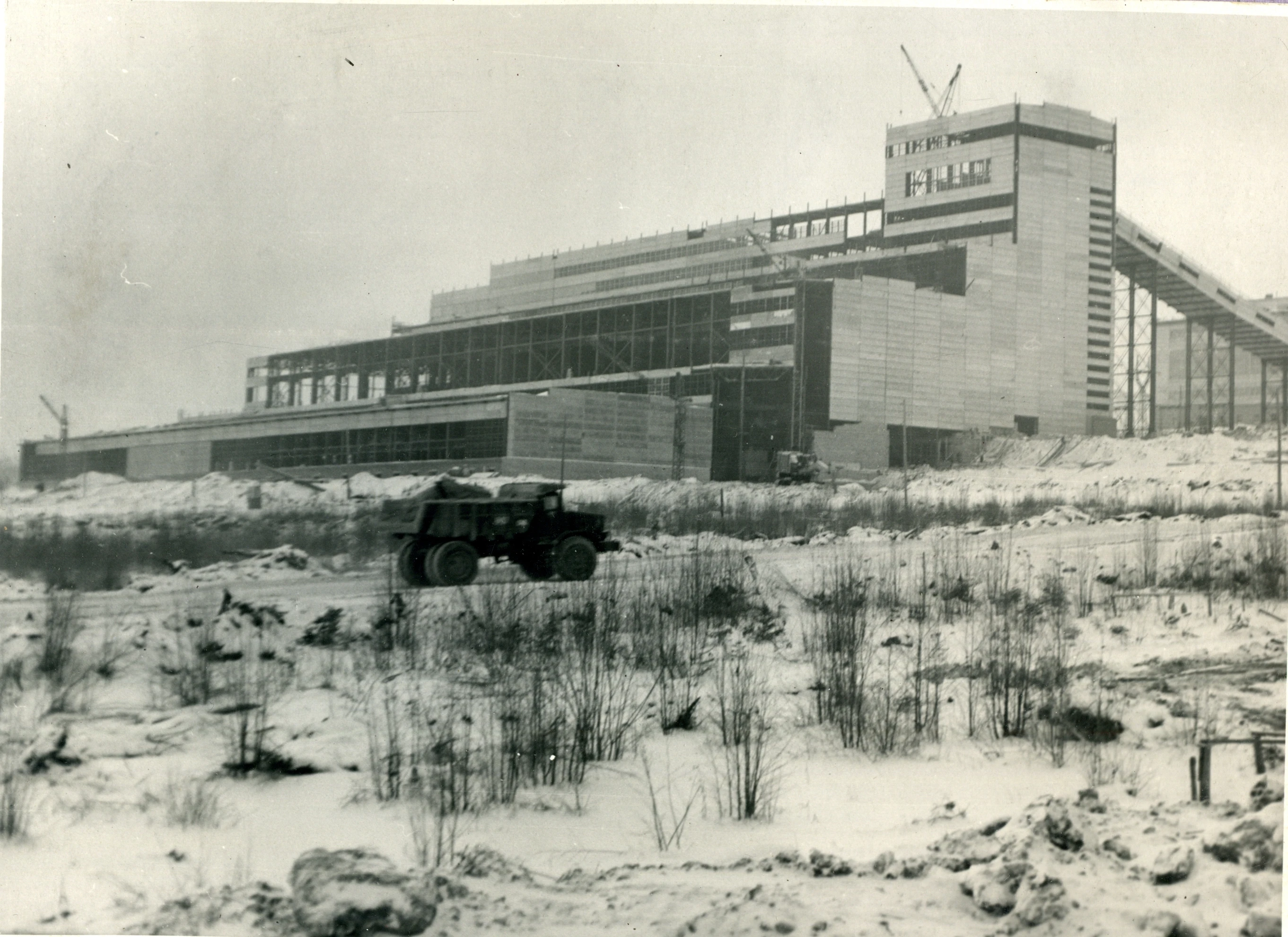1963 год, февраль. Строители ведут монтаж стеновых панелей на корпусе обогащения
