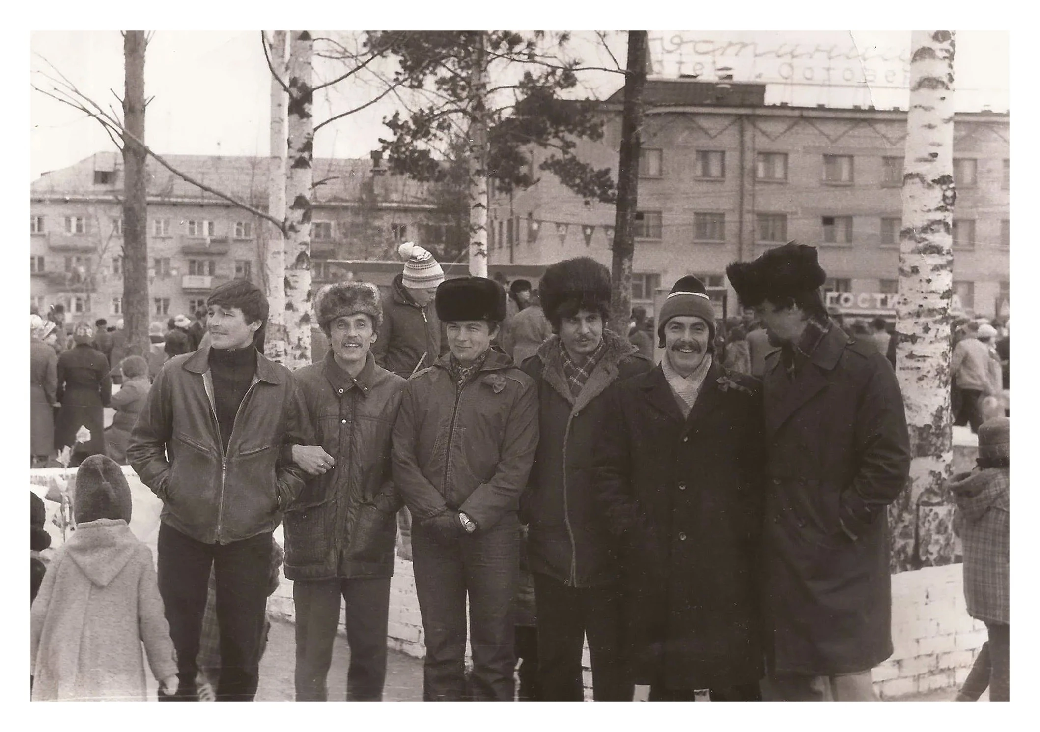 Качканар. 7 ноября. 1980-е годы. Справа налево. Борис Даутов, Сергей Грицков, Александр Ильичев, Валерий Шадрин, (?), (?). Из архива Ивана Канисева