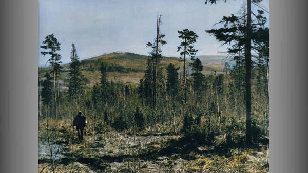 Качканарская ГРЭ. Вышка старшего бурового мастера Гаврилова К.А. на горе Еловой 1951г.