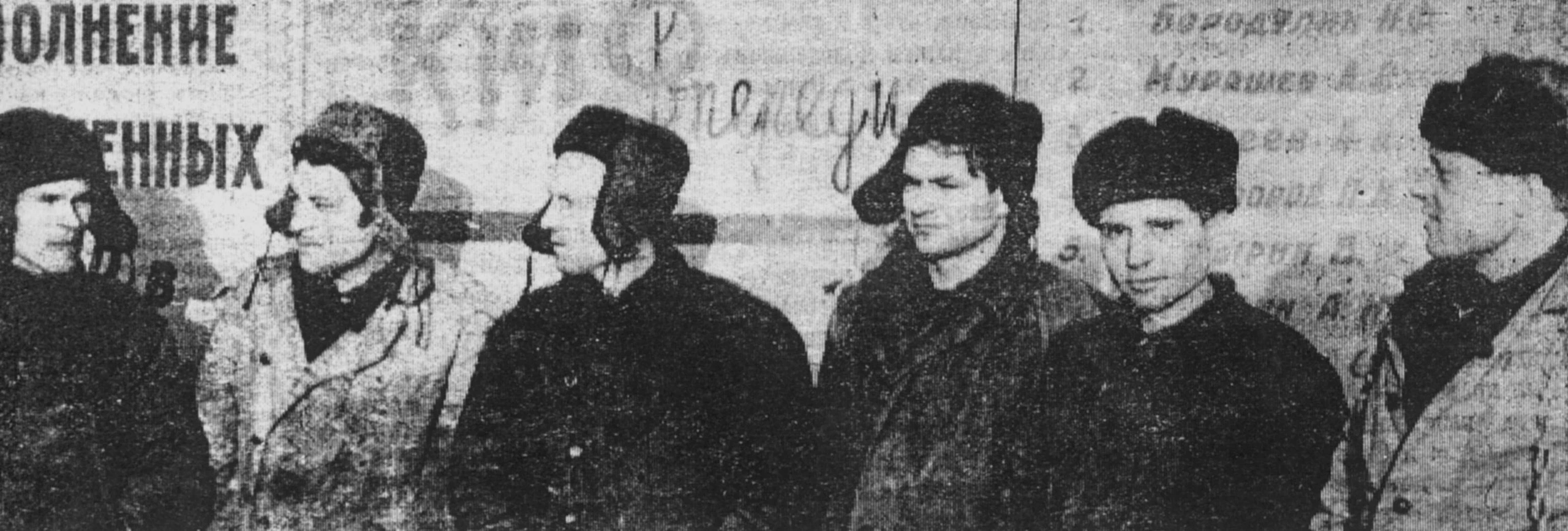 Качканар. Качканаррудстрой. СУ-2. Бригада Николая Бородулина. 1966 год. Виктор Серебренников, Владислав Римша, Евгений Соловьев, Леонид Толкач, П.Тарасов. Николай Бородули - бригадир - третий слева. Из архива Ивана Канисева