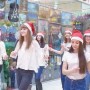 В помещении торгового центра учащиеся школ города в красных колпачках танцевали под веселую новогоднюю музыкуИсточник: