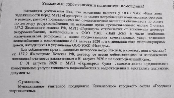 На досках объявлений в подъездах качканарских многоквартирных домов появились объявления о расторжении договора снабжения коммунальными ресурсами с УЖК "Наш дом"