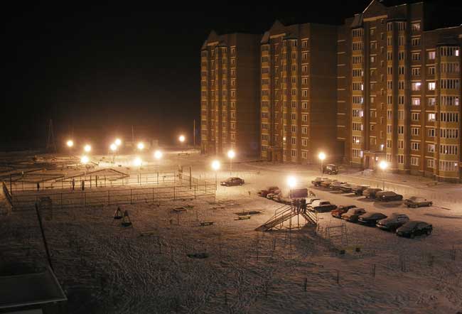 Левее то же есть фонари, только в кадр не попали - уж больно площадка большая... А в доме последние два подъезда ещё не сданы.
